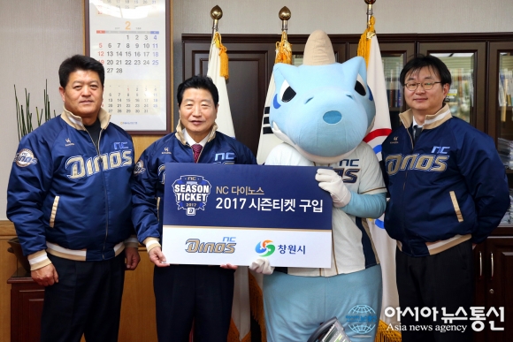 13일 안상수 창원시장이 시장집무실에서 신임 유영준 NC야구단 단장의 내방인사를 받고 ‘2017 프로야구 홈 시즌권’을 구매한 후 기념촬영 모습.(사진제공=창원시청) 지난해에 이어 경남 창원시가 2017 프로야구 NC다이노스의 ‘거침없는 질주’ 응원에 나섰다. 안상수 창원시... 2017-02-13