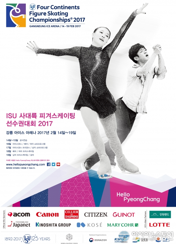 2017 ISU 사대륙 피겨 스케이팅 선수권대회 포스터.(사진제공=평창동계올림픽 조직위원회) 평창올림픽 테스트이벤트가 인기를 끌고 있는 가운데 가장 높은 인기를 누리는 2017 ISU 사대륙 피겨 스케이팅 선수권대회가 16일 강릉 아이스아레나에서 시작된다. 평창올림픽 피겨 종목 첫 테스트이... 2017-02-14