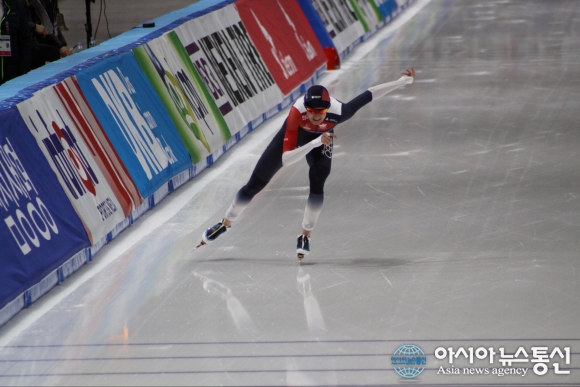 11일 강릉 오발 스피드스케이팅경기장에서 열린 국제빙상경기연맹(ISU) 스피드스케이팅 여자 5000m에서 금메달을 차지한 체코 마르티나 사블리코바가 역동의 질주를 펼치고 있다./아시아뉴스통신=이순철 기자 2017-02-11