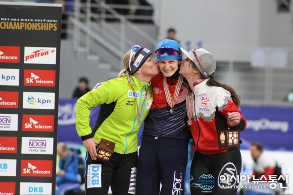 11일 강릉 오발 스피드스케이팅경기장에서 열린 국제빙상경기연맹(ISU)스피드스케이팅 여자 5000m에서 금메달을 목에 걸은 체코 마르티나 사블리코바, 은메달 독일 클라우디아페흐슈타아인, 동메달 캐나다 이바니 블롱댕이가 메달을 수상하고 서로 축하의 키스를 나누고 있다./아시아뉴스통신=이순철... 2017-02-11