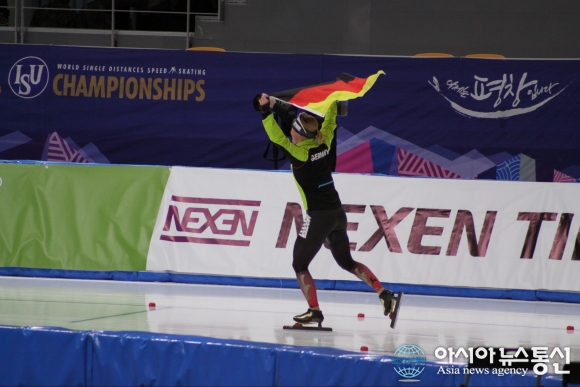 11일 강릉 오발 스피드스케이팅경기장에서 열린 국제빙상경기연맹(ISU) 스피드스케이팅 여자 5000m에서 은메달을 차지한 독일 클라우디아페흐슈타아인이 독일 국기를 휘날리면 축하 세레머니를 펼치고 있다./아시아뉴스통신=이순철 기자 2017-02-11
