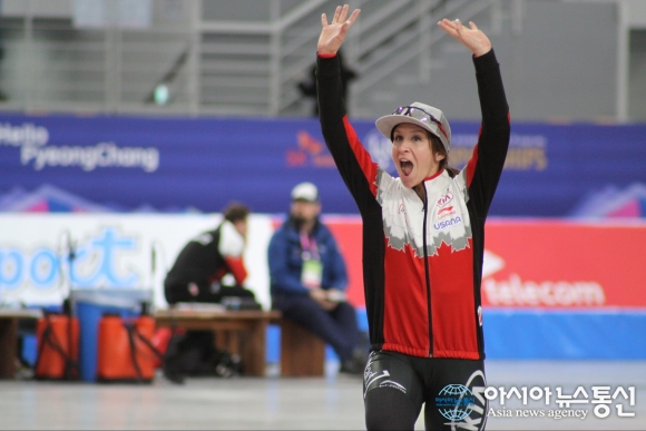 11일 강릉 오발 스피드스케이팅경기장에서 열린 국제빙상경기연맹(ISU) 스피드스케이팅 여자 5000m에서 동메달을 차지한 캐나다 이바니 블롱댕이가 메달을 수상하고 기쁨을 표현하고 있다./아시아뉴스통신=이순철 기자 2017-02-11