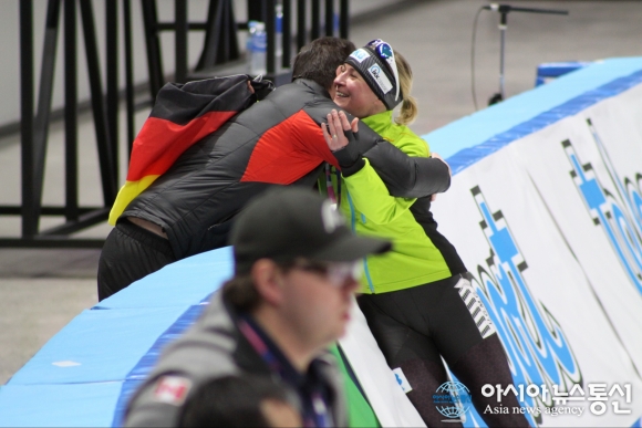 11일 강릉 오발 스피드스케이팅경기장에서 열린 국제빙상경기연맹(ISU) 스피드스케이팅 여자 5000m에서 은메달을 차지한 독일 클라우디아페흐슈타아인이 스태프와 축하의 포옹을 나누고 있다./아시아뉴스통신=이순철 기자 2017-02-11