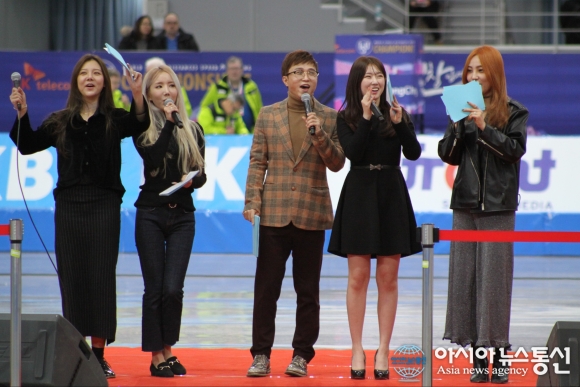 11일 강릉 오발 스피드스케이팅경기장에서 열린 국제빙상경기연맹(ISU) 스피드스케이팅선수권대회 오프닝 공연을 맡은 걸그룹 마마무가 개그맨 박성광 사회로 오프닝 행사를 갖고 있다./아시아뉴스통신=이순철 기자 2017-02-11