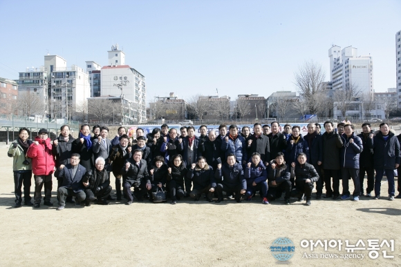12일 오전 박홍섭 마포구청장이 망원유수지 축구장에서 열린 마포구축구협회 신년인사회에 참석해 인사말씀 후 참석한 내빈들과 마포구축구협회 관계자 등과 기념사진을 찍고 있다.(사진제공=마포구청) 2017-02-12