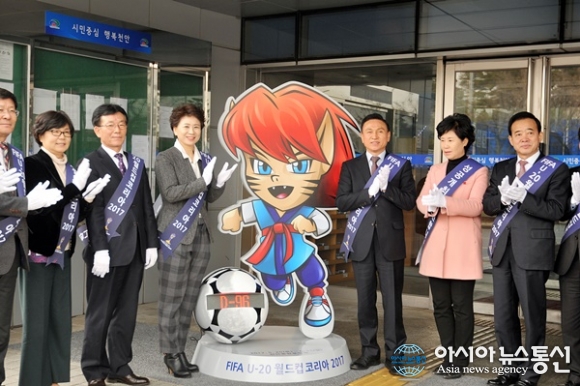 U-20월드컵 마스코트 차오르미 전광판 제막식. 구본영 (전광판 오른쪽 첫 번째) 천안시장, 엄소영(전광판 오른쪽 두 번째) 천안시의원, 박남주 천안시의원(전광판 왼쪽 첫 번째) 등이 행사에 함께하고 있다./아시아뉴스통신=김형태 기자 충남 천안시는 13일 시청 현관 앞에서 ‘FIFA U-20 월드... 2017-02-13