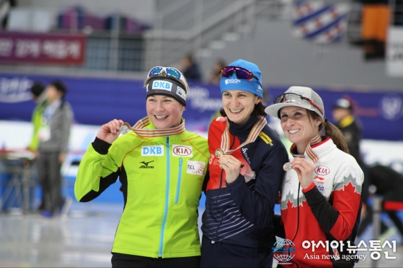 11일 강릉 오발 스피드스키이팅경기장에서 열린 국제빙상경기연맹(ISU)스피드스케이팅 여자 5000m에서 금메달을 목에 걸은 체코 마르티나 사블리코바, 은메달 독일 클라우디아페흐슈타아인, 동메달 캐나다 이바니 블롱댕이가 메달을 수상하고 활짝웃고 있다./아시아뉴스통신=이순철 기자 2017-02-11