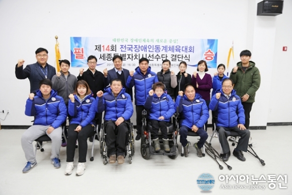 지난 3일 세종시장애인체육회 회의실에서 열린 제14회 전국장애인동계체육대회 세종시 선수단 결단식.(사진제공=세종시장애인체육회) 7일부터 오는 10일까지 4일간 강원도 일원에서 개최되는 제14회 전국장애인동계체육대회에 세종시 선수단이 출전한다. 세종시 선수단은 3개 종목(휠체어... 2017-02-07