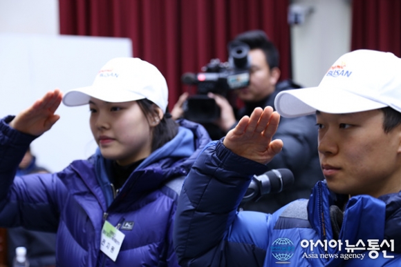 5일 부산시청 12층 소회의실에서 열린 전국동계체육대회 부산선수결단식에서 선수단 대표 이정찬(크로스컨트리) 선수와 전지원(피겨) 선수가 대표 선서 후 서병수 부산시장에게 경례하고 있다./아시아뉴스통신=박상언 기자 2017-01-05