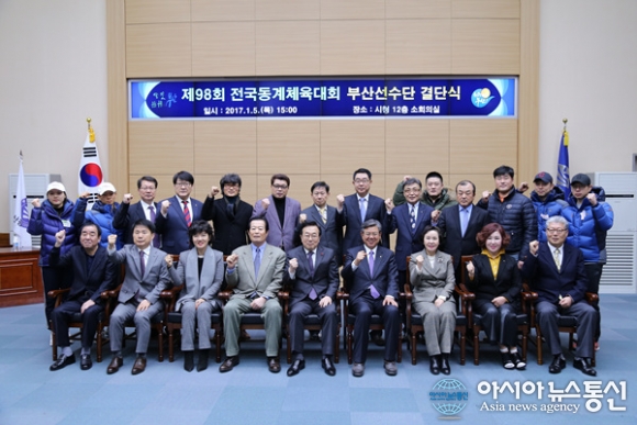 5일 부산시청 소회의실에서 전국동계체육대회 부산선수단결단식 후 선수단 선전을 기원하는 기념사진을 찍고 있다./아시아뉴스통신=박상언기자 2017-01-05