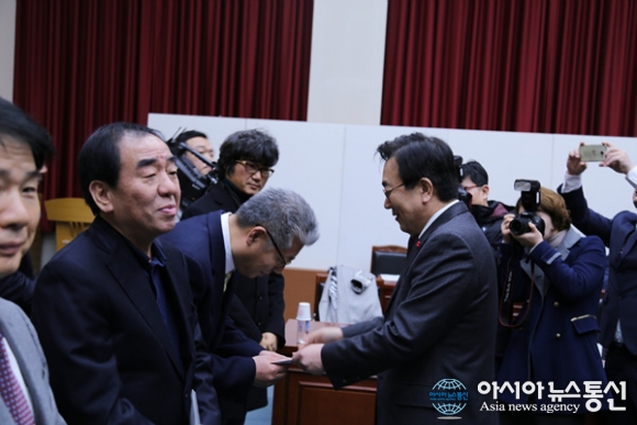 5일 서병수 시장이 전국동계체육대회 부산선수단 결단식에서 선전을 기원하는 격려금을 전달하고 있다. 격려금은 각 단체별 100만원씩 지급됐다./아시아뉴스통신=박상언 기자 2017-01-05