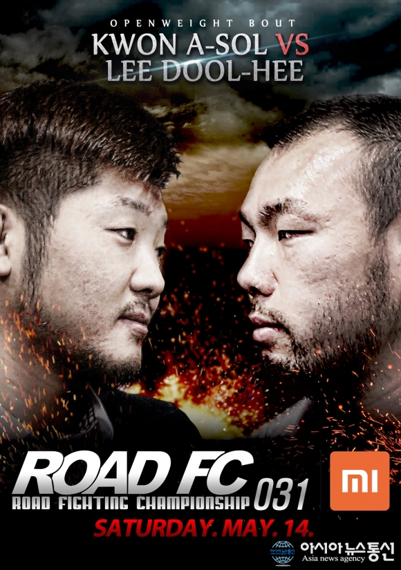 ROAD FC 031 티저 포스터.(자료제공=로드FC) 온갖 디스와 신경전으로 기대를 모으고 있는 ‘라이트급 챔피언’ 권아솔(30, APGUJEONG GYM)과 ‘미들급’ 이둘희(27, BROS GYM)의 티저 포스터가 공개됐다. 권아솔과 이둘희는 오는 5월 14일 서울 장충체육관에서 개최되는 XIAOMI ROAD FC 031의 메인 이벤트에서 격돌한다. 체급... 2016-04-09