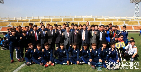 9일 안상수 창원시장이 창원종합운동장에서 열린 ‘제6회 창원시축구협회장기 기관?기업체 축구대회’ 개회식에 참석, 참가 선수들을 격려하고 기념촬영을 하고 있다.(사진제공=창원시청) 안상수 경남 창원시장은 9일 지역 축구동호인들의 소통과 화합의 축제인 ‘제6회 창원시축구협회장기 기관?기업체... 2016-04-09