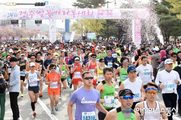9일 경북 경주에서 열린 제25회 경주 벚꽃마라톤 대회에 국내외 1만5000명의 마라톤 선수, 동호인들이 참가해 힘찬 레이스를 펼치고 있다.(사진제공=경주시청) 제25회 경주벚꽃마라톤 대회가 9일 보문단지와 시내 일원에서 국내.외 마라톤 선수 및 동호인 등 1만5000여명이 참가한 가운데 힘찬 레이스를 펼쳤... 2016-04-09