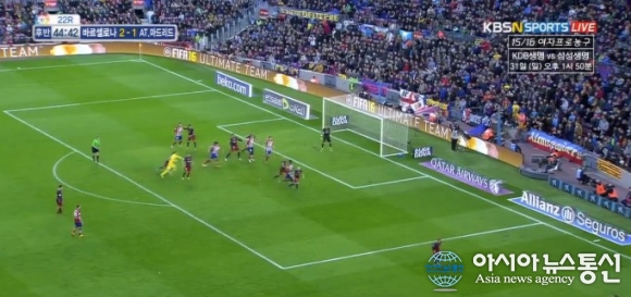 ? KBS N SPORTS 방송화면 캡처.(출처=KBS) '챔피언스리그' 수아레스의 동점골과 역전골로 바르셀로나가 승리했다. 바르셀로나는 6일(한국시간) 홈구장 누캄프에서 열린 AT 마드리드와의 유럽챔피언스리그(UEFA) 챔피언스리그 8강 1차전에서 2대 1로 승리했다. AT 마드리드 토레스는 전반 25분 코케의 패스를 넘겨 받... 2016-04-06