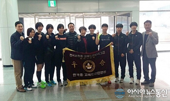 4일 경북 청송여고 배드민턴팀이 우승 후 임태천 감독과 장기영 코치와 함께 기념사진을 찍으며 '파이팅'을 하고 있다.(사진제공=청송여고) ? 경북 청송여자고등학교(교장 조철숙)가 4일 김천실내체육관에서 열린 '2016 전국봄철종별배드민턴리그전'에서 여고부 단체전 우승을 차지했다. 창단 후 ... 2016-04-05