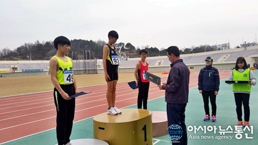 지난 1일 폐막된 경북소년체육대회에서 800m 금메달을 획득한 경북 영덕 창수초등학교 인천분교 6년생인 전기수 학생이 시상식을 갖고 있다.(사진제공=영덕교육청) 경북 영덕의 창수初 인천분교 6년생인 전기수 학생이 경북도소년체육대회 800m 달리기에서 금메달을 획득하면서 전국소년체육대회에 출전하... 2016-04-04