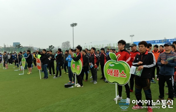 3일 충북 충주시 탄금대 축구장에서 충주애플리그 개회식이 열린 가운데 참가한 각 클럽 선수들이 입장하고 있다.(사진제공=충주시축구협회) 충북 충주지역 생활체육 축구클럽 동호인들의 축제인 충주애플리그가 50대 무궁화클럽과 훼밀리클럽 경기를 시작으로 6개월의 대장정에 들어갔다. 충주시축구협... 2016-04-04