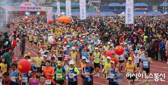 3일 오전 합천공설운동장에서 열리는 제15회 합천벚꽃마라톤대회에 마라토너들이 힘차게 출발하고 있다.(사진제공=합천군청) 전국 최고의 명품 마라톤대회인 제15회 합천벚꽃마라톤대회가 3일 합천공설운동장에서 마라토너, 가족 등 2만여명이 참가한 가운데 성대하게 열렸다. 이날 대회는 오전 9시30분 42... 2016-04-03