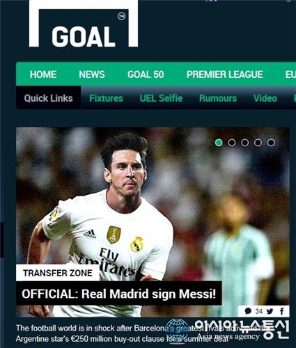 ? 자료사진.(사진출처=골닷컴 홈페이지 캡처) 바르셀로나의 메시가 엘클라시코를 앞두고 라이벌팀인 레알 마드리드로 이적한다는 기사가 축구팬들의 시선을 모으고 있다. 골닷컴은 "리오넬 메시가 이번 시즌이 끝나면 레알 마드리드에 합류하기로 갑작스럽게 결정됐다"며 "계약 기간은 5년에 이적료는 5... 2016-04-02
