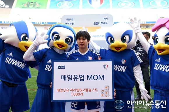 권창훈, 매일유업 MOM 선정 모습.(사진제공=수원블루윙즈) 수원삼성 권창훈이 2016 시즌 첫 번째 '매일유업MOM(Man Of Match)'으로 선정됐다. 권창훈은 2일 수원 빅버드에서 열린 상주 상무와의 홈 경기에서 본인의 시즌 1호골을 기록하고 산토스의 결승골에도 결정적인 플레이를 펼치는 활약으로 상주전 매일우... 2016-04-02