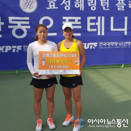 안동오픈대회 복식우승을 차지한 배도희-김나리(우측).(사진제공=대한테니스협회) 수원시청의 김나리가 안동오픈 여자 단식과 복식에서 우승하며 대회 2관왕에 올랐다. 2일 경북 안동시민운동장 테니스장에서 열린 대회 여자 단식 결승에서 4번 시드 김나리가 7번 시드 홍현휘(NH농협은행)를 세트스코어 2-... 2016-04-02