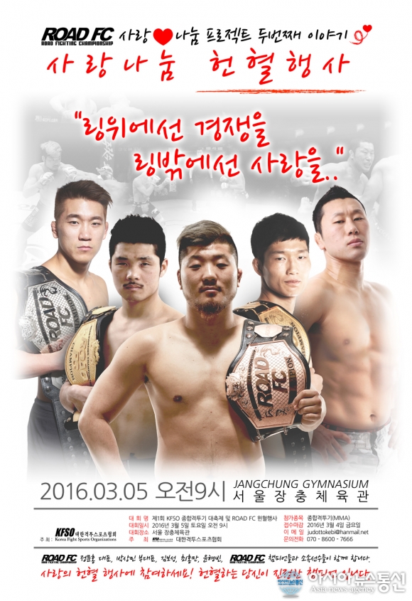 ? ROAD FC 사랑나눔 프로젝트.(사진제공=로드FC) 3월 5일 서울 장충체육관에서 개최되는 ‘제 1회 KFSO 종합격투기 대축제 및 ROAD FC 사랑나눔 프로젝트 두 번째 이야기 ‘사랑 나눔 헌혈행사’가 하루 앞으로 다가왔다. ‘제 1회 KFSO 종합격투기 대축제 및 ROAD FC 사랑나눔 프로젝트 두번째 이야기 ‘사랑나눔 헌... 2016-03-04