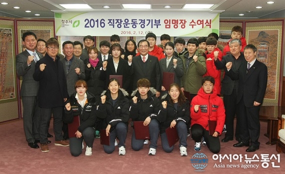 12일 충북 청주시청 접견실에서 직장운동경기부 영입 임용장 수여식이 열린 가운데 이승훈 시장과 선수 등이 기념촬영을 하고 있다.(사진제공=청주시청) 충북 청주시 직장운동경기부가 18명을 영입했다. 이들은 남자 양궁부 코치 1명과 선수로 남녀 양... 2016-02-12