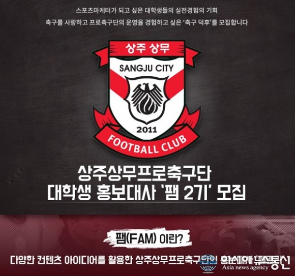 상주상무 팸 2기 모집 홍보물.(사진제공=상주상무) 상주상무프로축구단(대표이사 백만흠)이 2016시즌을 함께 만들어갈 팸 2기 모집을 시작한다고 4일 밝혔다. 모집인원은 12명이며, 모집기간은 오는 17일 오후 6시까지이다. 서류접수 후 접수 인원에 ... 2016-02-04