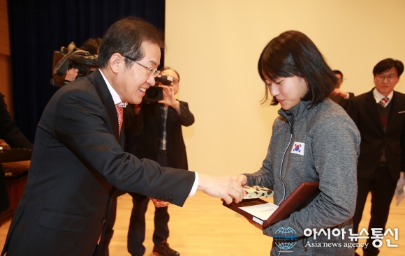3일 홍준표 경남도지사가 최우수 선수로 뽑힌 사이클 김수현 선수에게 시상하며 격려하고 있다.(사진제공=경남도청) 경상남도체육회는 3일 오후 2시 경남도청 대회의실에서 ‘2015년 경상남도체육상∙2016년 체육장학금 수여식’을 가졌다. 홍... 2016-02-04
