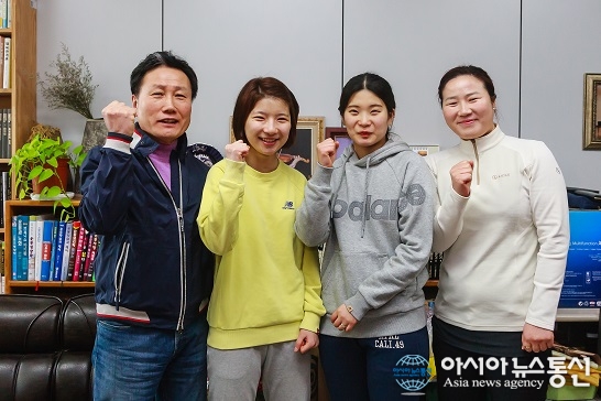 다음 달 창단할 충북 청주대학교 여자 탁구팀 감독을 맡은 최종만 교수와 조안나ㆍ김하연 선수, 김버들 코치(왼쪽부터)가 파이팅을 외치고 있다.(사진제공=청주대학교) 충북 청주대학교(총장 김병기)가 도내 대학 최초로 여자 탁구팀을 창단한다. 4일 ... 2016-02-04