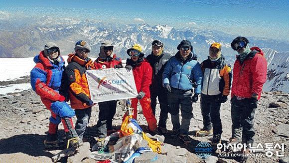 예스 구미(Yes Gumi) 7대륙 세계최고봉 원정대(대장 최청돈)가 지난 22일 남아메리카 아콩카구아(아르헨티나) 현지로 출국해 아콩카구아(6962m) 정상 등정에 성공한 후 원정대명이 적힌 작은 현수막을 펼쳐들고 포즈를 취하고 있다. 원정대는 지난 4일 체육회관에서 출정식을... 2016-01-27