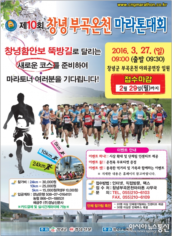 창녕 부곡온천마라톤 포스터 모습.(사진제공=창녕군청) 경남 창녕군과 경남신문이 공동 주최하는 '제10회 창녕 부곡온천 마라톤대회'가 오는 3월27일 부곡온천 일원에서 열린다. '창녕 부곡온천관광특구에서 온천도 즐기고, 3월의 벚꽃길 ... 2016-01-20