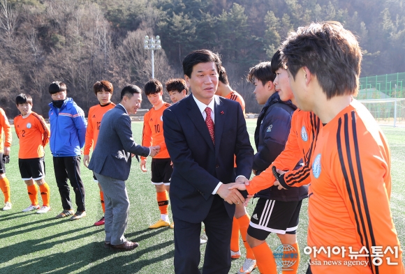 12일 허기도 경남 산청군수가 생초체육공원 내 생초 제1∙2축구장에서 전지훈련인 선수들을 격려하고 있다.(사진제공=산청군청) 허기도 경남 산청군수는 지난 12일 생초면을 순방하면서 생초체육공원 내 생초 제1∙2축구장에서 전지훈련 중인 청... 2016-01-14