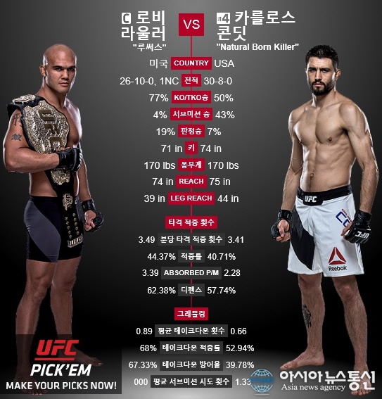 자료사진.(사진제공=UFC 공식 홈페이지) 로비 라울러와 카를로스 콘딧이 3일 미국 라스베이거스 MGM 그랜드가든 아레나에서 열리는 'UFC 195' 메인이벤트에서 대결을 펼친다. 라울러는 2014년 12월 조니 헨드릭스를 꺾고 챔피언벨트를 차지했다. 지... 2016-01-02