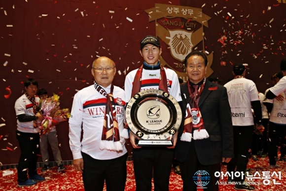 3일 오후 상주상무 구단주인 이정백 경북 상주시장이 상주시 실내체육관(신관)에서 열린 '현대오일뱅크 2015 k리그 챌린지 우승 기념식'에서 박항서 감독, 우승패를 든 강민수 선수와 함께 기뻐하고 있다.(사진제공=상주시청) 2015-12-04