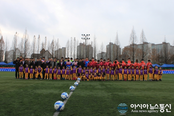 4일 건양대 운동장에서 열린 자선경기에 앞서 K리그 스타들이 참석한 내·외빈들과 기념촬영을 하고 있다./아시아뉴스통신=전철세 기자 고종수, 염기훈, 오장은, 정대세 등 K리그 그라운드를 종횡무진 누비고 있는 축구 스타들이 논산에서 자선경... 2015-12-04
