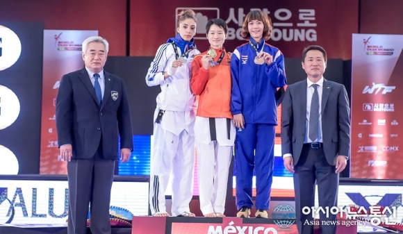 5일,조정원 세계태권도연맹 총재(왼쪽 첫번째)가 멕시코 멕시코시티 살라 데 아르마스(Sala de Armas) 경기장에서 열린 2015 태권도 월드그랑프리 파이널 대회 첫 날 여자 -49kg 시상식에서 메달 수상자들과 기념 사진을 찍고 있다.(사진제공=세계태권도연맹) 2015-12-06