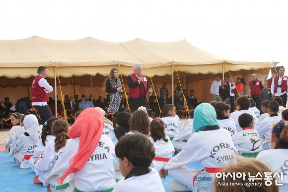 세계태권도연맹 조정원 총재가 12월 1일 요르단 자타리(Zaatari) 시리아난민 캠프에서 현지시간 오후 1시에 “WTF 태권도아카데미(WTF Taekwondo Academy)” 개관식에서 축사를 하고 있다.(사진제공=세계태권도연맹) 1일 요르단 시리아난민 자타리(Zaatari) ... 2015-12-02
