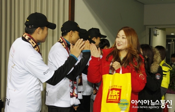 3일 오후 상주상무 선수들이 '현대오일뱅크 2015 k리그 챌린지 우승'을 기념하는 자축연이 열리는 경북 상주시실내체육관(신관)을 찾은 한 여성팬이 들어오자 하이파이브로 답하고 있다./아시아뉴스통신=김철희 기자 2015-12-03