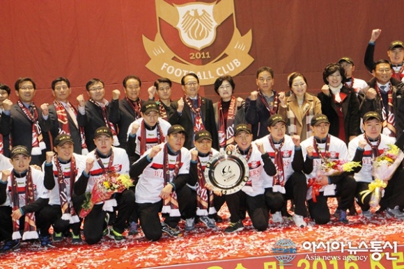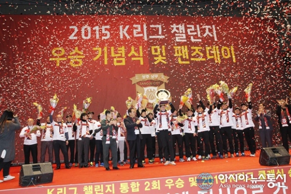 3일 오후 상주상무 선수와 감독, 코치스탭들이 경북 상주시실내체육관(신관)에서 열린 '현대오일뱅크 2015 k리그 챌린지 우승기념식'에서 이정백 구단주, 고명현 국군체육부대장, 백만흠 축구단 대표이사, 김종태 국회의원, 남영숙 상주시의회 의장 등 내빈들과 ... 2015-12-03