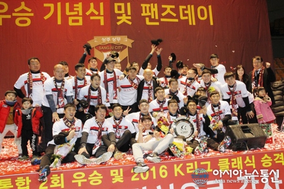 3일 상주상무 선수와 감독, 코치스탭들이 경북 상주시 실내체육관(신관)에서 열린 '현대오일뱅크 2015 k리그 챌린지 우승기념식'에서 우승패를 들고 환호하고 있다./아시아뉴스통신=김철희 기자. 2015-12-03