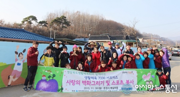 30일 경북 문경시 배실마을을 찾아 벽화그리기 봉사활동에 나선 경북도생체 생활체육7330서포터즈 참가자들이 기념사진을 찍고 있다.(사진제공=경상북도생활체육회) 경상북도생활체육회(회장 김성환)는 생활체육7330서포터즈들과 함께 30일 문경시 배... 2015-11-30