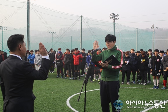 21일 충북 청주시 서원구 남이면 가좌리 청주풋볼센터에서 아시아뉴스통신충북본부 주최 제2회 직지배풋살대회가 열린 가운데 김경선 아시아뉴스통신충북본부장과 송민국 풋살대회 선수대표가 선서를 하고 있다./아시아뉴스통신=김지수 기자 전국 ... 2015-11-21
