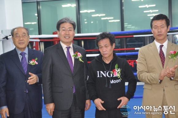 20일 오후 7시 인천 남동구 구월1동 아시아드선수촌아파트내 드림프라자 5층 "남동진아복싱체육관" 개관식에서 오른쪽부터 안진아 관장, 장정구 전 챔피언, 허영 회장, 이생호 고문 등이 기념촬영을 하고 있다./아시아뉴스통신=김태일, 이명기 기자 ... 2015-11-21