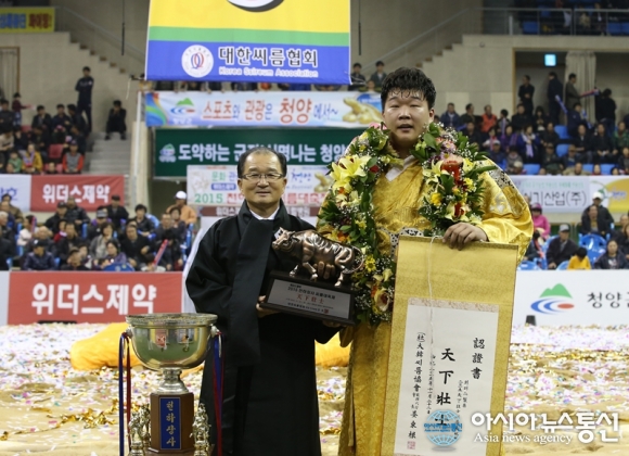‘2015 천하장사씨름 대축제’가 지난 18일부터 22일까지 청양군민체육관에서 참가 선수들의 열띤 경쟁과 인근 지역에서 모여든 관중들의 높은 관심 속에 성황리에 막을 내렸다.사진은 천하장사에 등극한 정창조 선수가 이석화 청양군수와 기념촬영을 하고 있는 ... 2015-11-23