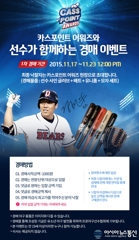 경매 이벤트 두산 김현수.(사진제공=㈜엠비씨플러스) ㈜엠비씨플러스는 '2015 카스포인트 어워즈' 개최를 기념해 베이스볼투나잇 페이스북에서 수상 선수들의 사인 야구 용품 경매 행사를 시작한다고 발표했다. 카스포인트 타자·투수 TOP3... 2015-11-18
