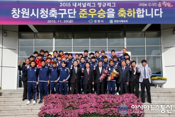 20일 안상수 경남 창원시장은 ‘2015 내셔널리그’에서 정규리그 준우승의 쾌거를 이룬 창원시청 축구단과 체육회 관게자들을 시청으로 초청, 선수들을 격려하고 청사 앞에서 기념촬영을 하고 있다.(사진제공=창원시청) 안상수 경남 창원시장은 2... 2015-11-20