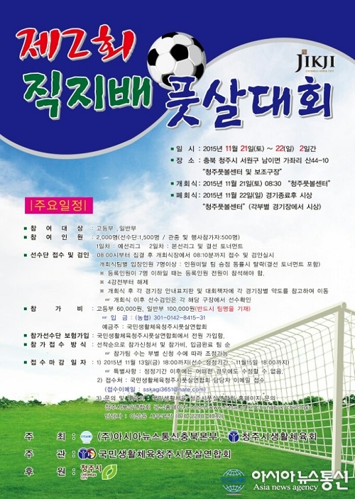 제2회 직지배풋살대회 주요 일정표.(자료제공=청주시풋살연합회) 전국 풋살동호인들의 ‘한마당 큰 잔치’ 제2회 직지배풋살대회가 오는 21~22일 열린다. 아시아뉴스통신 충북본부와 청주시생활체육회가 주최하고 국민생활체육 청주시풋살연... 2015-11-14