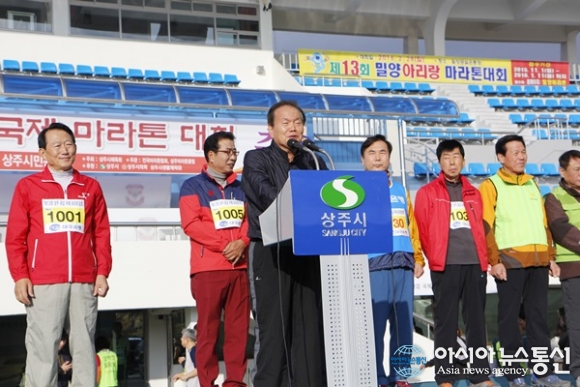 15일 오전 이정백 경북 상주시장 겸 상주시체육회장이 '제13회 상주곶감국제마라톤대회' 개회식에서 대회사를 하고 있다./아시아뉴스통신=김철희 기자 2015-11-15